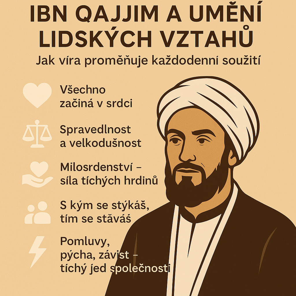 Když si představíme skutečně moudrého člověka, možná se nám vybaví někdo, kdo zná svaté texty zpaměti. Ale Ibn Qajjim al-Džawzíja šel mnohem dál. Tento velký myslitel 14. století nechtěl jen správně chápat Boží vůli – chtěl ji žít. A právě v tom je jeho síla. Ukazuje nám, že vztahy mezi lidmi nejsou jen společenskou dovedností, ale duchovní cestou.